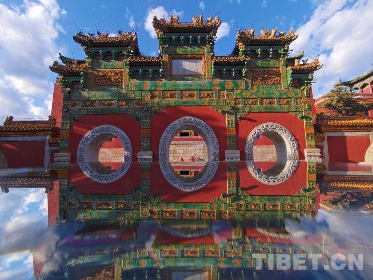 圖為須彌福壽之廟主體建筑大紅臺前象征神權(quán)、皇權(quán)的琉璃牌坊。能通過它的只有皇帝、親王、郡王、貝勒、貝子及三品以上臺吉 攝影:歐帆