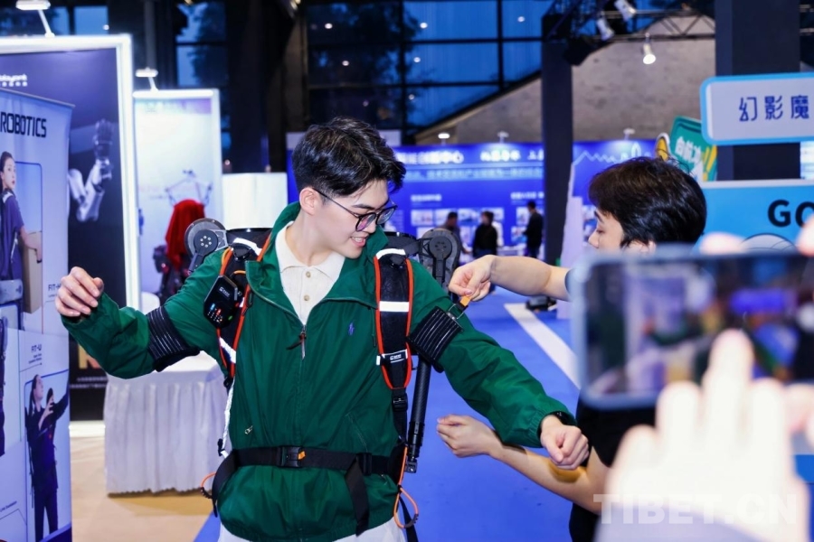 圖為游客們正在體驗(yàn)?zāi)軌蜉o助提升運(yùn)動(dòng)表現(xiàn)的智能穿戴設(shè)備。