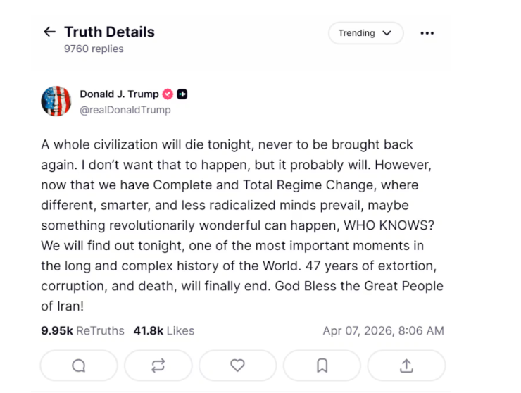 特朗普在真實社交平臺發(fā)布的貼文,發(fā)文威脅伊朗稱,“今晚,整個文明將消亡”