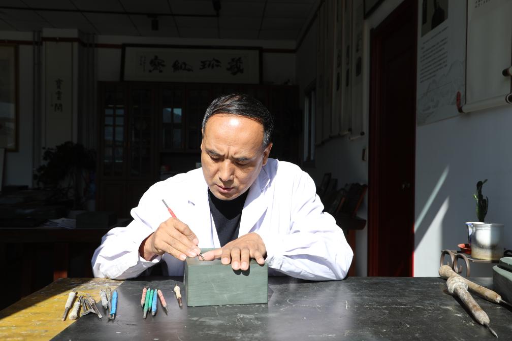 盧保勝在工作室創(chuàng)作洮硯。新華社記者梁軍 攝