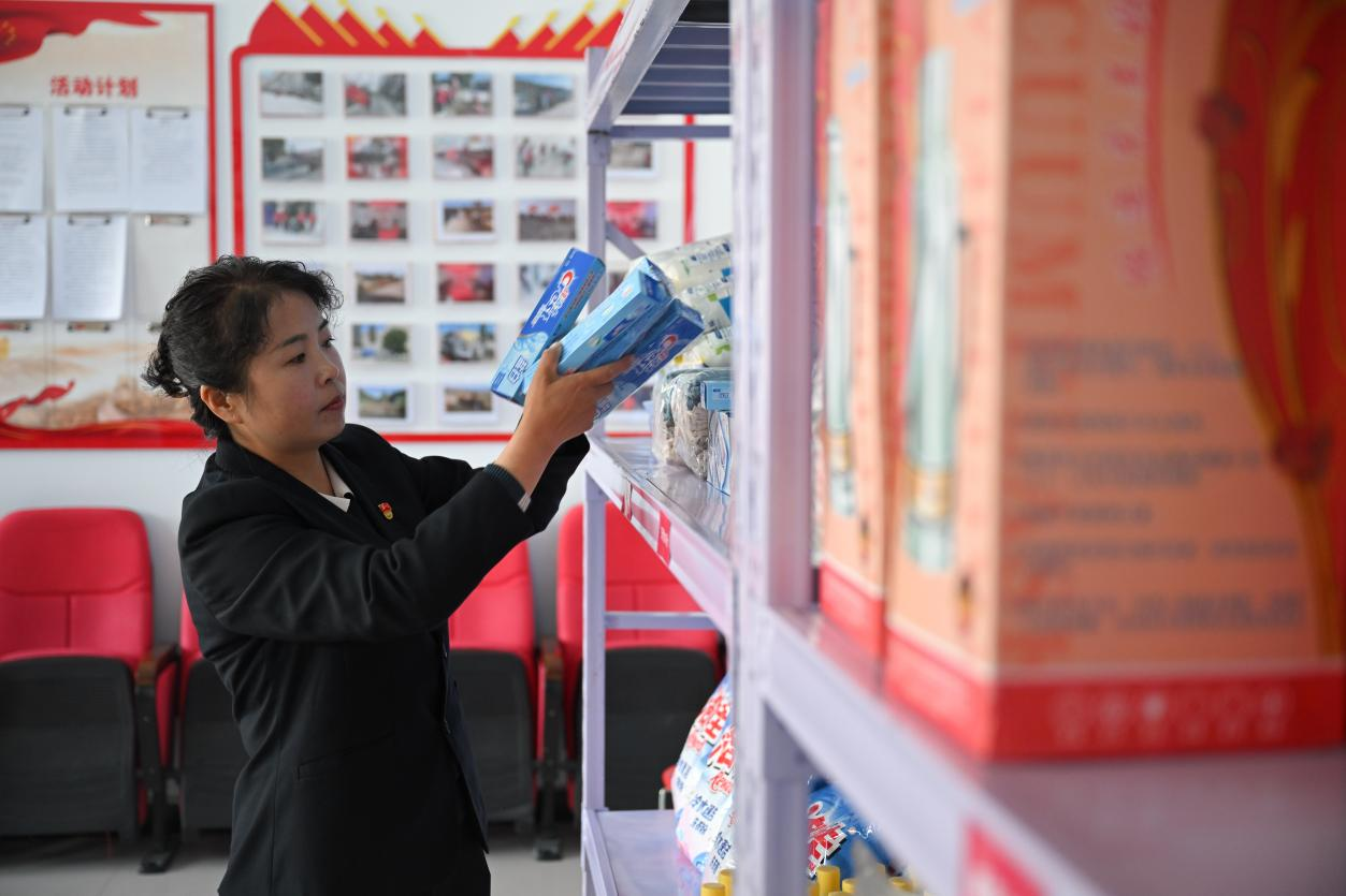 4月13日,才堂村黨支部書記胡海英正在整理“積分超市”的獎(jiǎng)品。新華社記者 張龍 攝