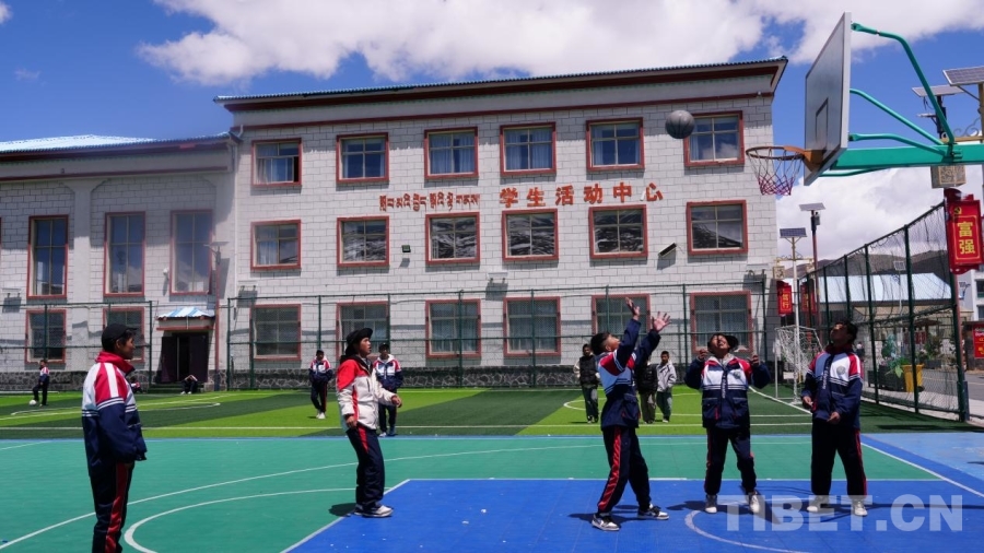 錯(cuò)那市中學(xué)的學(xué)生們課間打籃球