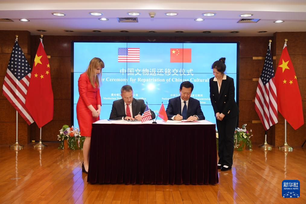 4月17日,在美國紐約中國駐紐約總領館,中美雙方代表出席中國流失文物藝術品返還移交儀式。新華社記者 李睿 攝