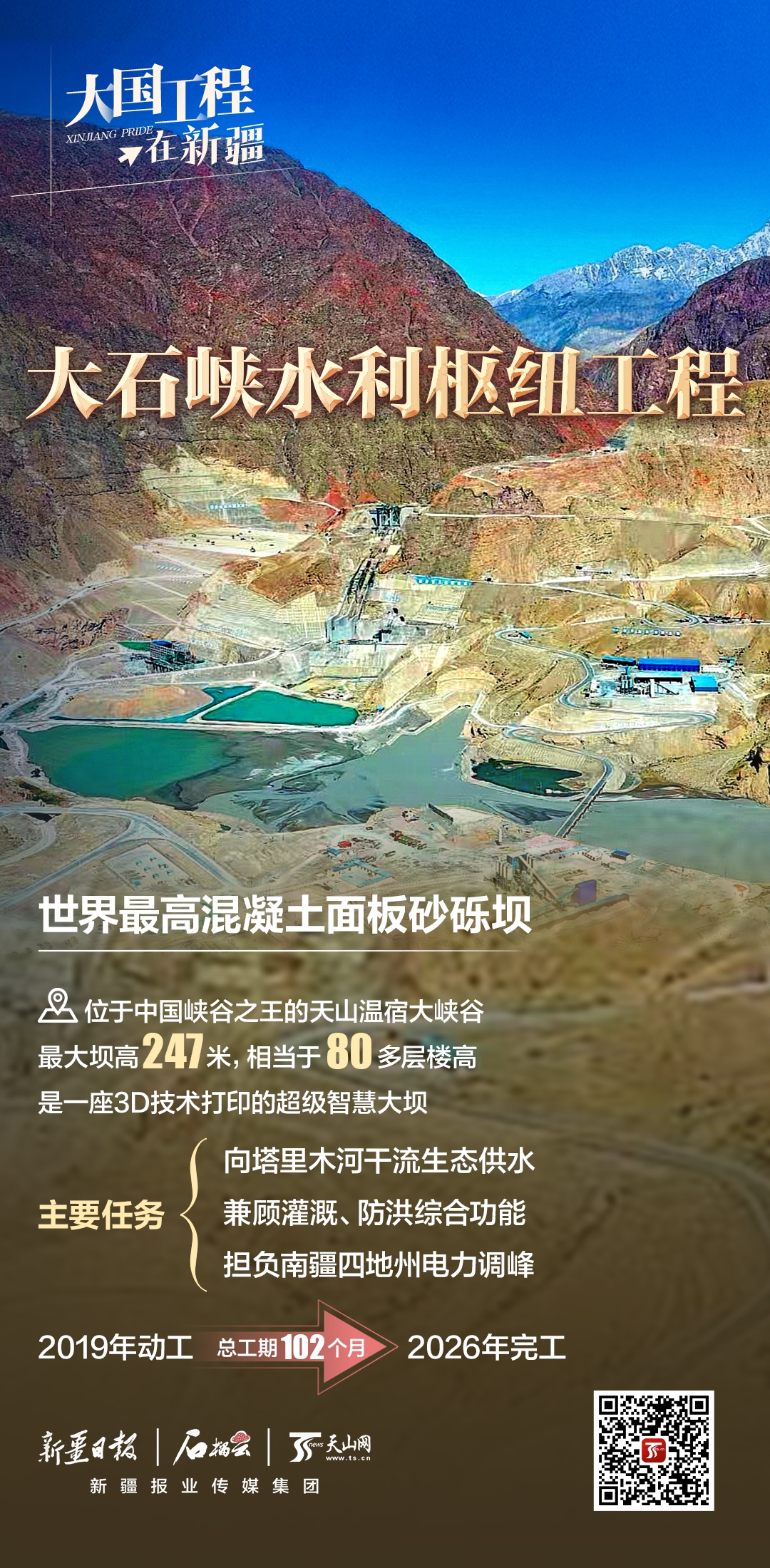 新疆大石峽水利樞紐工程建在號稱中國峽谷之王的天山溫宿大峽谷之中,攔河壩主壩為混凝土面板砂礫石壩,最大壩高247米,壩頂長度606米,比三峽大壩還高62米,是當(dāng)之無愧的天塹工程。