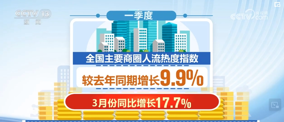 國家信息中心數據就顯示,一季度,全國主要商圈人流熱度指數較2023年同期增長9.9%,其中,3月份同比增長17.7%。