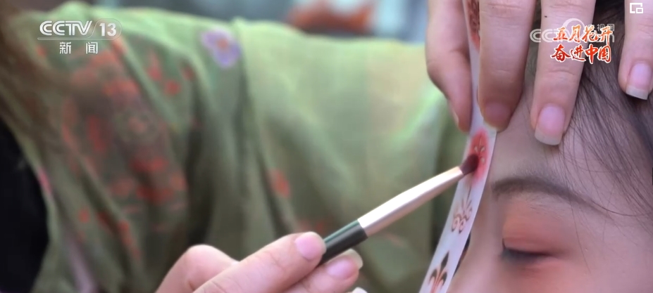 花鈿是古代女性在額頭部位點綴的一種花飾?,F在的胡芯銀,不僅會根據顧客的年齡、臉型和服裝的樣式來搭配不同風格的花鈿,還會給小姐姐們做一些傳統文化的講解。胡芯銀說,要想做得更好,就要多看多學。
