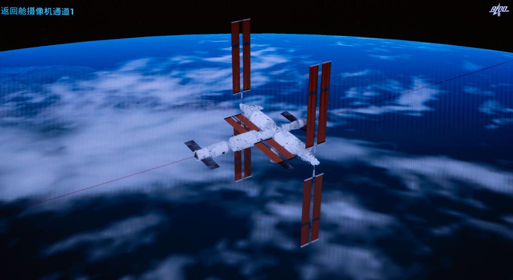 2024年1月18日在北京航天飛行控制中心拍攝的天舟七號貨運(yùn)飛船向空間站組合體靠攏的畫面。