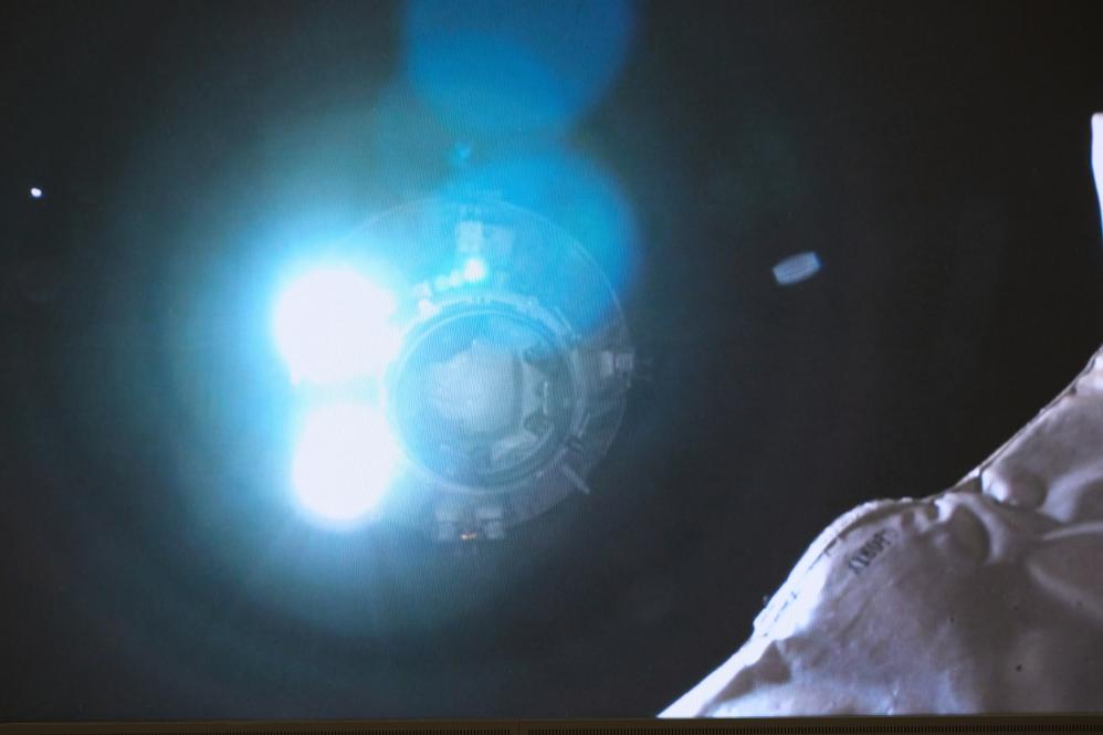 2023年12月21日在北京航天飛行控制中心拍攝的神舟十七號航天員唐勝杰開展艙外操作的畫面。