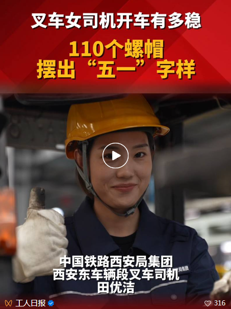 “95后”姑娘田優(yōu)潔是中國鐵路西安局集團(tuán)有限公司西安東車輛段的一名叉車司機(jī),平時(shí)的主要工作就是駕駛叉車完成車鉤的裝卸作業(yè)?!拔逡弧眹H勞動(dòng)節(jié)之際,田優(yōu)潔開著叉車用110個(gè)螺帽擺出了“五一”字樣,這技術(shù),真的穩(wěn)!