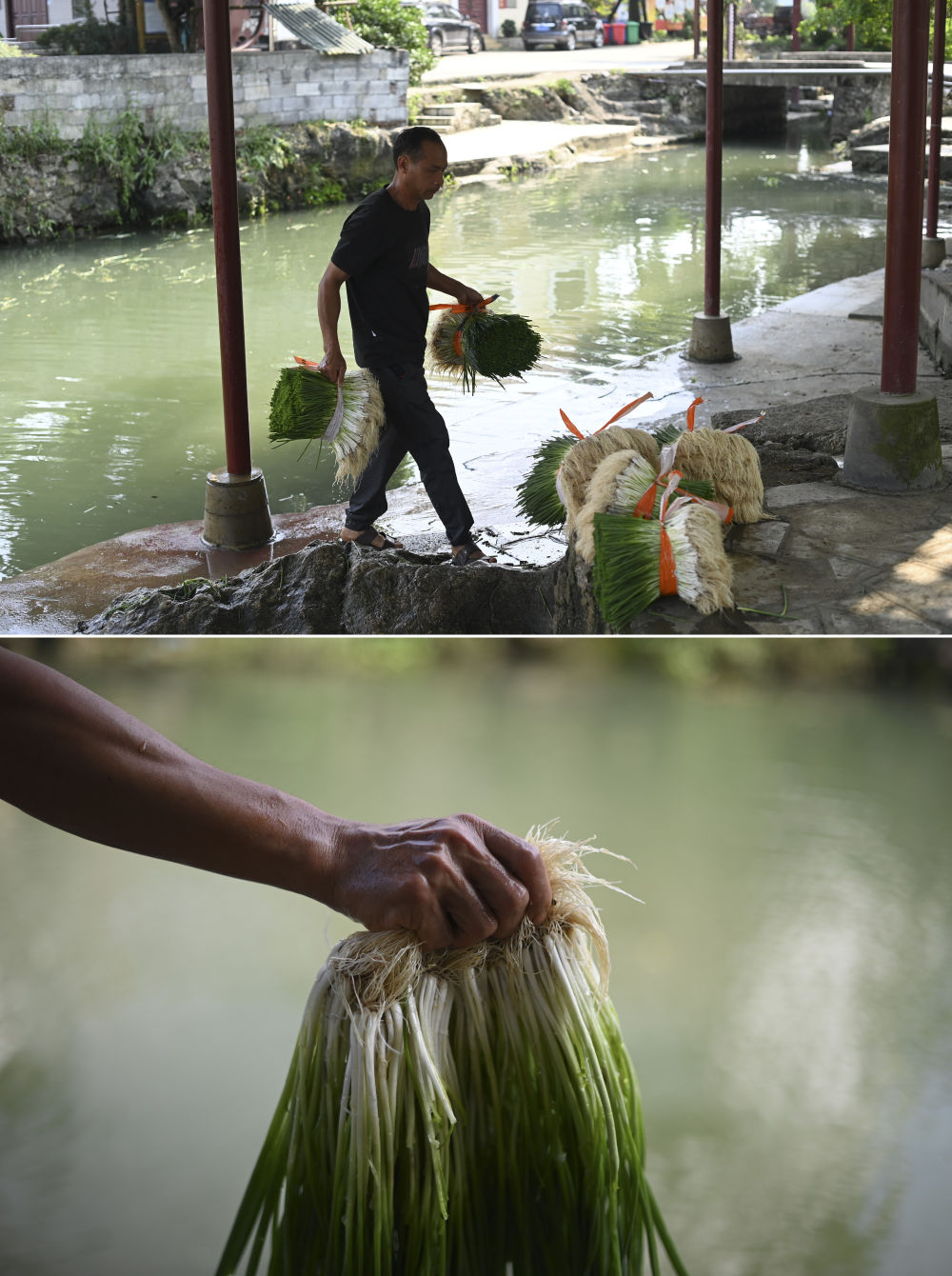 在廣西柳州市柳江區(qū)三都鎮(zhèn)覺山村,村民韋文中搬運香蔥,準(zhǔn)備供應(yīng)市場(4月16日攝)。香蔥種植產(chǎn)業(yè)是覺山村村民增收致富的支柱產(chǎn)業(yè),韋文中種植10多畝香蔥。