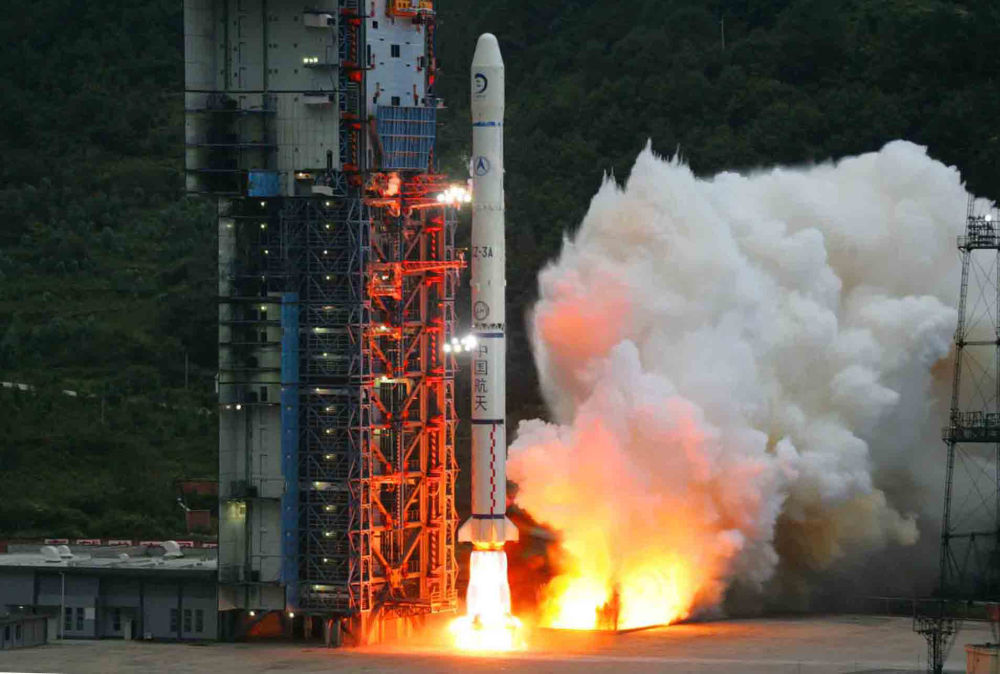 2007年10月24日18時(shí)05分,搭載著我國首顆探月衛(wèi)星嫦娥一號(hào)的長(zhǎng)征三號(hào)甲運(yùn)載火箭在西昌衛(wèi)星發(fā)射中心三號(hào)塔架點(diǎn)火發(fā)射。新華社記者 李剛 攝