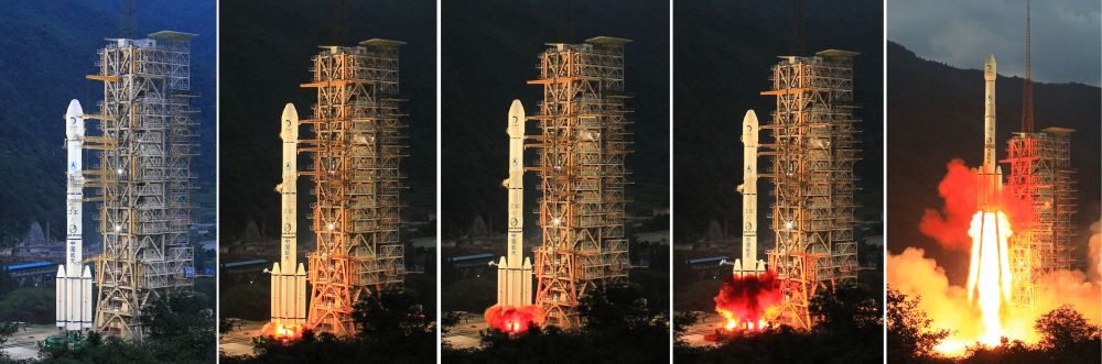 2010年10月1日18時(shí)59分57秒,搭載著嫦娥二號(hào)衛(wèi)星的長(zhǎng)征三號(hào)丙運(yùn)載火箭在西昌衛(wèi)星發(fā)射中心點(diǎn)火發(fā)射。這是嫦娥二號(hào)發(fā)射瞬間的情景(拼版照片)。新華社記者 李剛 攝