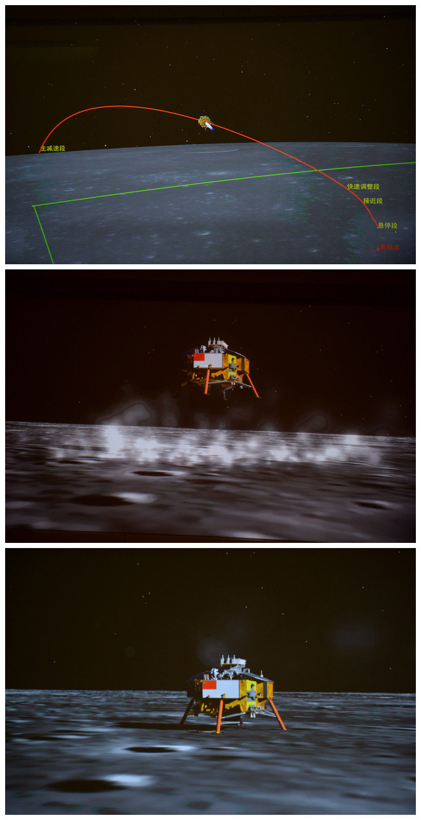 這是2019年1月3日在北京航天飛行控制中心拍攝的降落過程(示意圖)。2019年1月3日10時(shí)26分,嫦娥四號(hào)探測(cè)器自主著陸在月球背面南極-艾特肯盆地內(nèi)的馮·卡門撞擊坑內(nèi),實(shí)現(xiàn)人類探測(cè)器首次在月球背面軟著陸。新華社記者 金立旺 攝