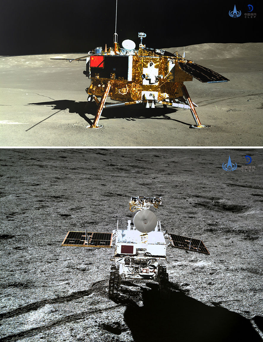 2019年1月11日下午,嫦娥四號(hào)著陸器與玉兔二號(hào)巡視器工作正常,在“鵲橋”中繼星支持下順利完成互拍(拼版照片)。新華社發(fā)(國家航天局供圖)