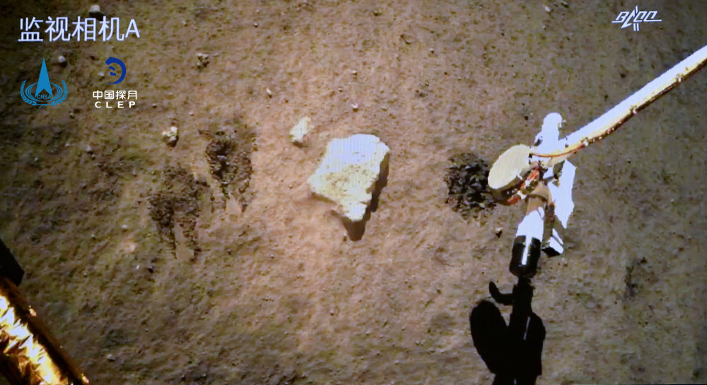 2020年12月2日,嫦娥五號(hào)探測(cè)器在月球表面自動(dòng)采樣。新華社發(fā)(國家航天局供圖)