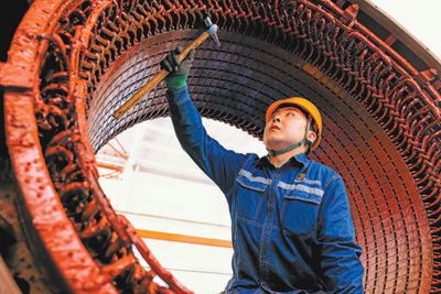 在包(頭)神(木)鐵路機(jī)務(wù)分公司東勝檢修設(shè)備車間,青年職工正對(duì)機(jī)車主發(fā)電機(jī)部件進(jìn)行質(zhì)量檢查。 張 棖 李尚昆攝影報(bào)道
