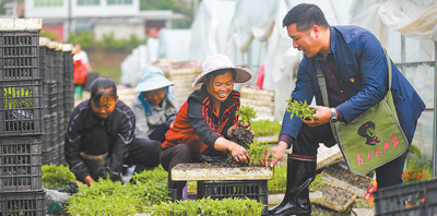 貴州省黔西市雨朵鎮(zhèn)小水井村駐村第一書記符蘭平(右一)向村民了解生產(chǎn)情況。 周訓(xùn)超攝(人民視覺(jué))