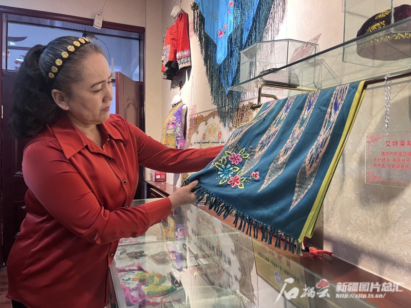 哈密刺繡國家級代表性傳承人阿加汗·賽買提家,不僅有刺繡工廠,還有一個(gè)展示哈密刺繡的展廳。石榴云/新疆日報(bào)記者 王晶晶攝