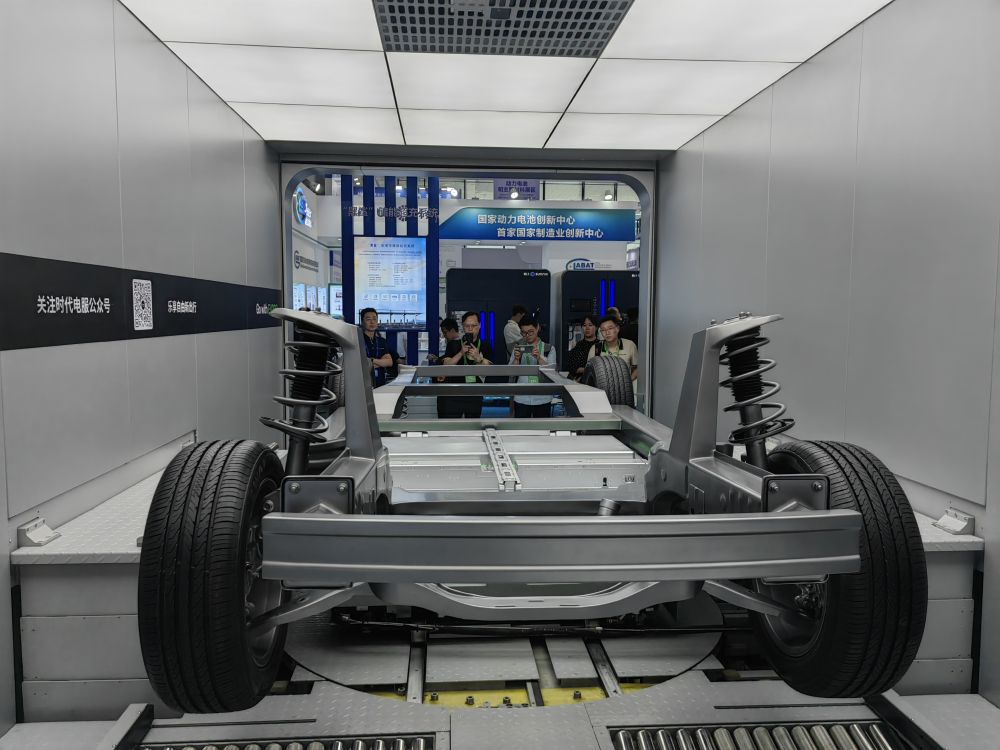這是在四川省宜賓市舉行的2023世界動(dòng)力電池大會上展示的新能源汽車換電系統(tǒng)(2023年6月9日攝)。新華社記者 胡旭 攝
