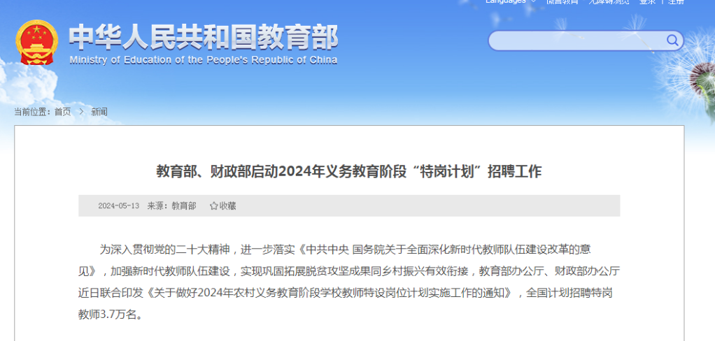 記者5月13日從教育部獲悉,教育部辦公廳、財政部辦公廳近日聯(lián)合印發(fā)通知,就做好2024年農村義務教育階段學校教師特設崗位計劃實施工作進行部署。根據通知,2024年全國計劃招聘“特崗計劃”教師37000名。