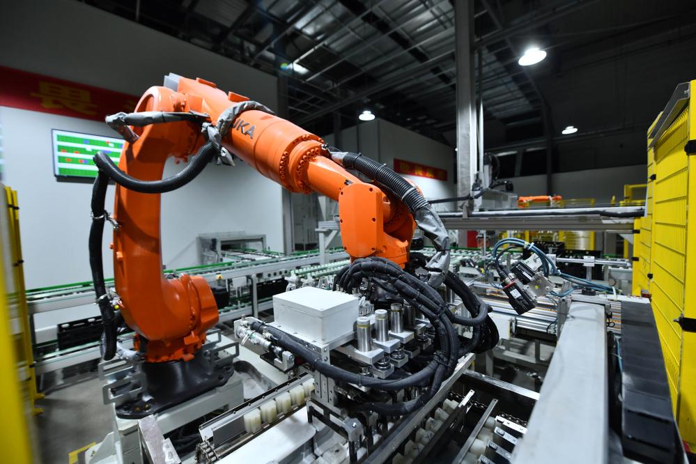 在廣西柳州市一家新能源汽車電池生產(chǎn)企業(yè),機(jī)器人在生產(chǎn)線上作業(yè)(2023年5月10日攝)。新華社記者黃孝邦攝