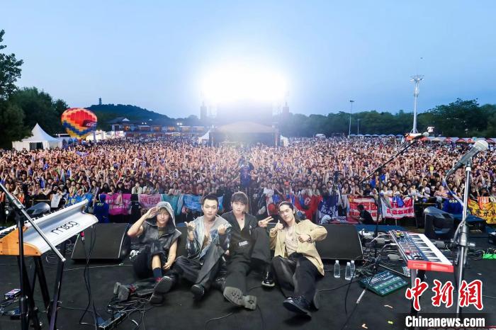 西施音樂(lè)節(jié)現(xiàn)場(chǎng),臺(tái)灣“傻子與白癡”樂(lè)隊(duì)與觀眾留影?!≈T暨臺(tái)辦供圖
