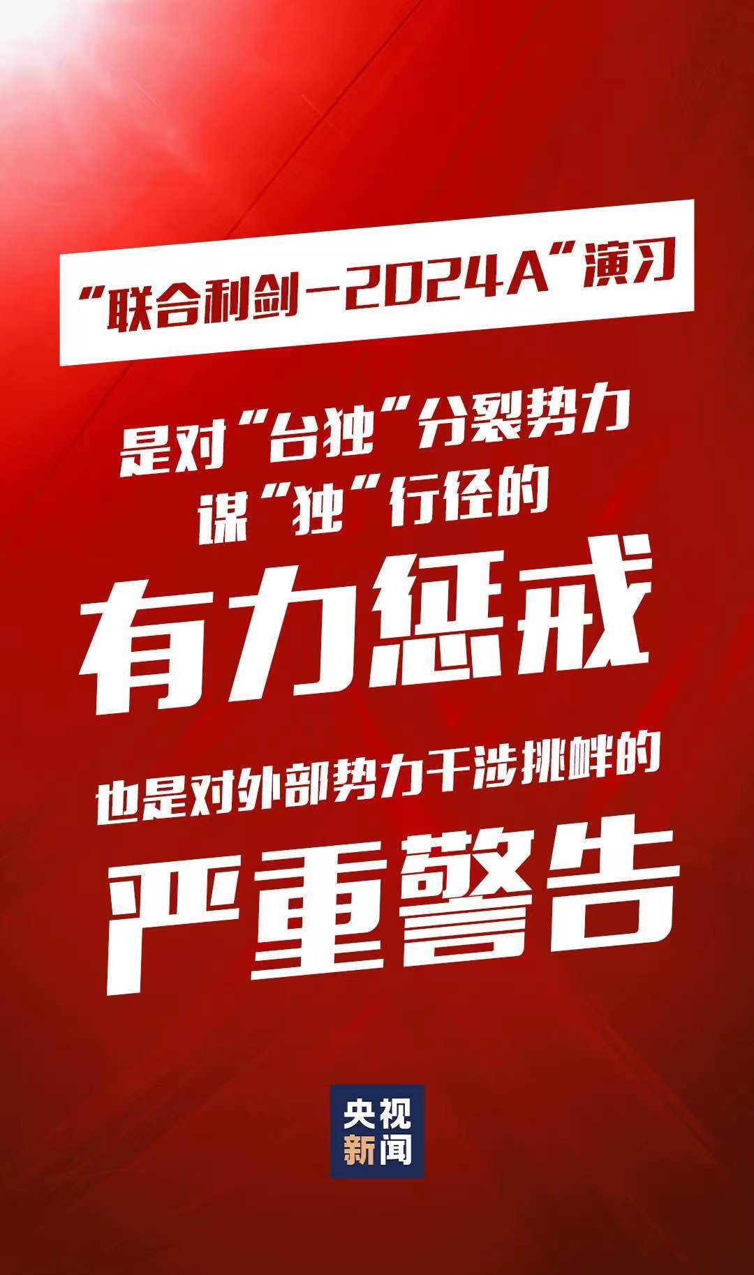 5月23日至24日,中國人民解放軍東部戰(zhàn)區(qū)組織戰(zhàn)區(qū)陸軍、海軍、空軍、火箭軍等兵力,位臺島周邊開展“聯(lián)合利劍-2024A”演習(xí),重點演練聯(lián)合海空戰(zhàn)備警巡、聯(lián)合奪取戰(zhàn)場綜合控制權(quán)、聯(lián)合精打要害目標等科目,艦機抵近臺島周邊戰(zhàn)巡,島鏈內(nèi)外一體聯(lián)動,檢驗戰(zhàn)區(qū)部隊聯(lián)合作戰(zhàn)實戰(zhàn)能力。這是中國維護國家主權(quán)和領(lǐng)土完整的正義之舉,也是對“臺獨”分裂勢力謀“獨”行徑的有力懲戒,對外部勢力干涉挑釁的嚴重警告。