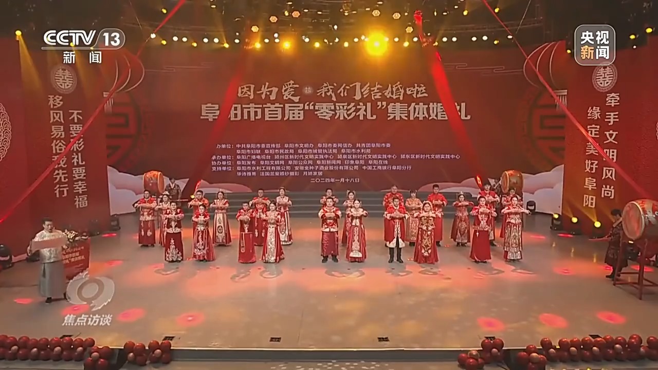 不久前,安徽阜陽當?shù)?0余家媒體共同直播了一場“零彩禮”集體婚禮,58對新人在親人、觀禮嘉賓及廣大網友祝福聲中,鄭重許下相守一生的承諾。