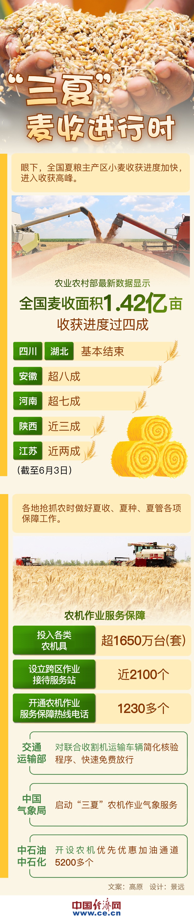 進(jìn)入六月,全國(guó)“三夏”大規(guī)模小麥機(jī)收工作全面展開(kāi),收獲進(jìn)度加快。據(jù)農(nóng)業(yè)農(nóng)村部最新數(shù)據(jù)顯示,截至6月3日,全國(guó)麥?zhǔn)彰娣e1.42億畝,收獲進(jìn)度過(guò)四成。