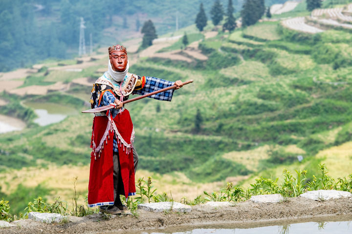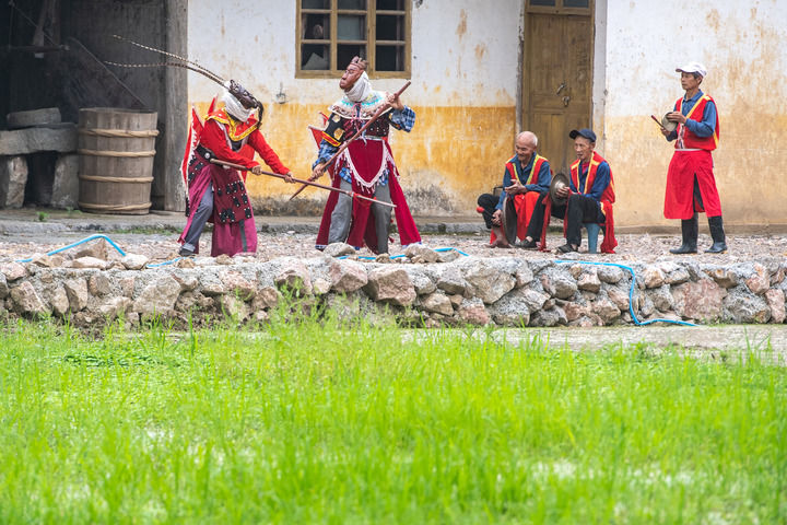 又是一年武陵山間水稻插秧季。在重慶市酉陽土家族苗族自治縣銅鼓鎮(zhèn)清泉村,水稻田間時時回響著極具地方特色的戲曲唱段,一群特別的非遺技藝陽戲(酉陽土家面具陽戲)表演者,往來于田間地頭。他們忙時翻土培秧,準備著水稻插秧,閑時則舞槍弄劍,排演著表演劇目。