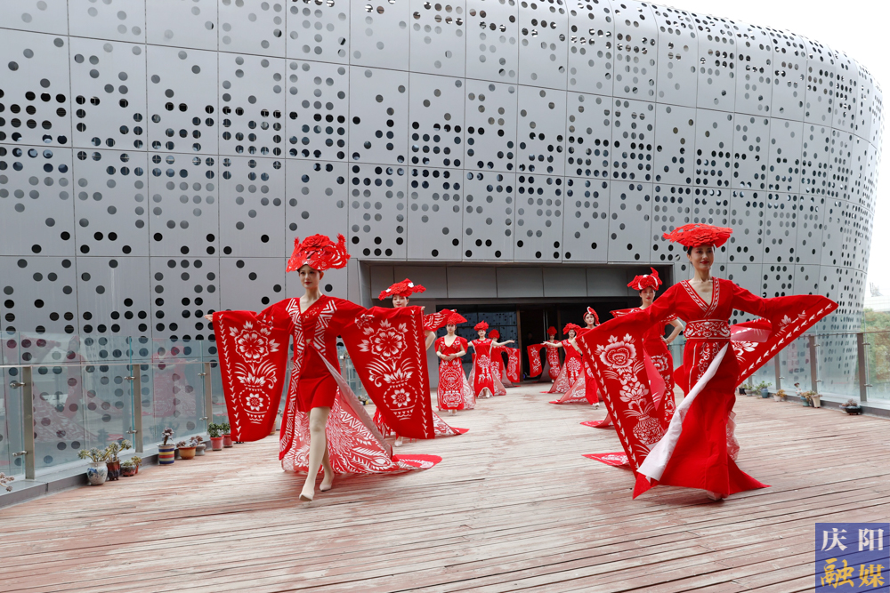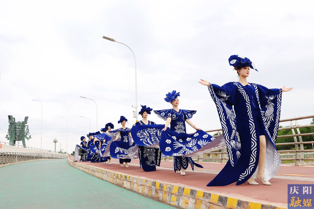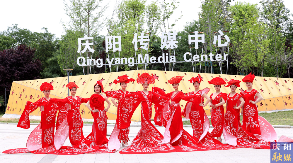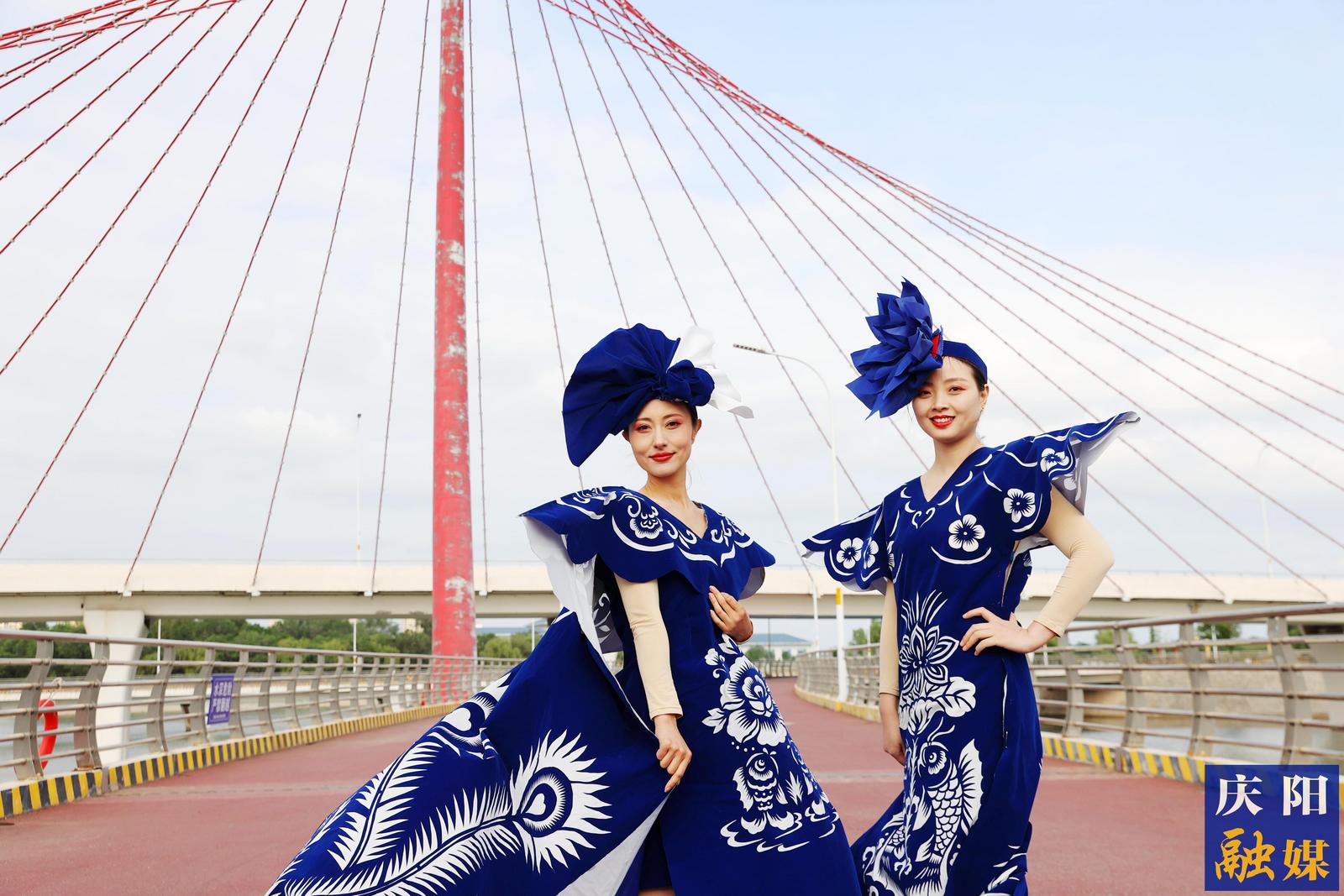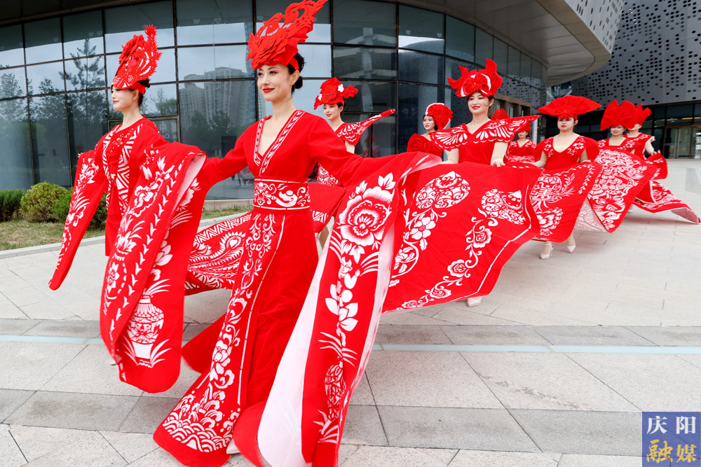 主播們身著刻鏤龍紋、鳳紋、抓髻娃娃、生命樹、魚鉆蓮、牡丹等剪紙紋樣,大V領、魚尾裙、聳肩收腰的“剪云裳”剪紙服裝,行走在傳媒大廈、西峰區(qū)彩虹橋、慶陽市城市海綿運動綠地等處,全方位、多角度地展示了剪紙服裝的特色與魅力。