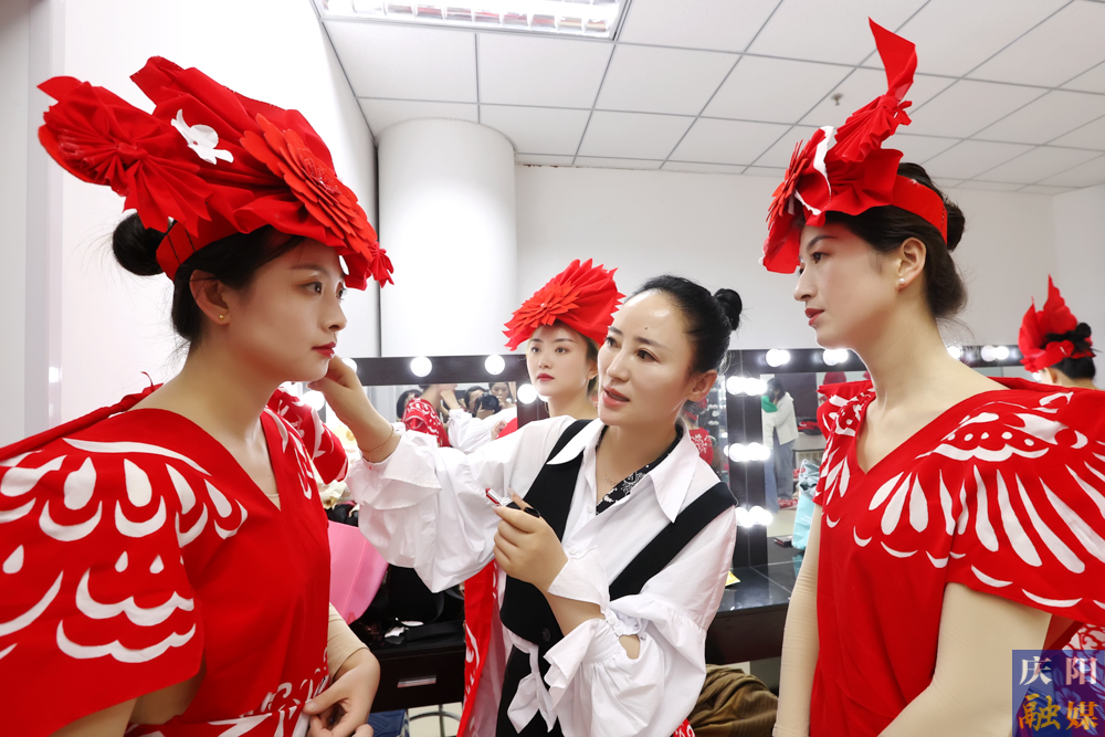 鎮(zhèn)原縣文化館館長、“剪云裳”慶陽剪紙系列服裝設計者常燕為模特打理造型。