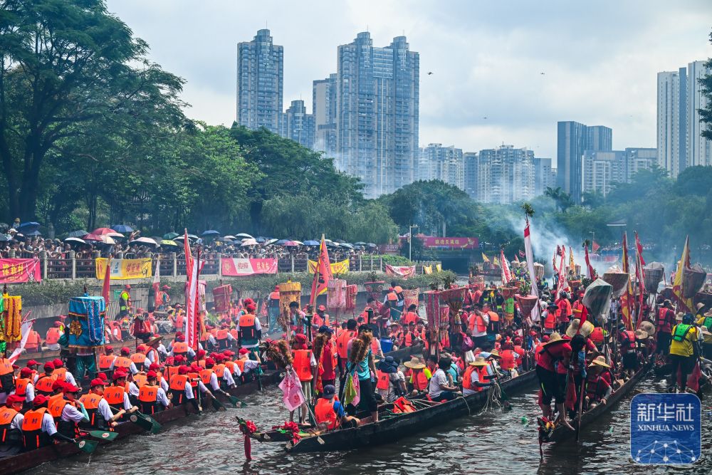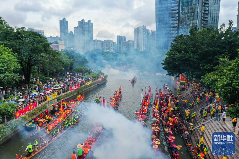 6月10日,獵德村熱鬧的傳統(tǒng)龍舟“龍船景”與繁忙的現(xiàn)代都市交匯相融(無(wú)人機(jī)照片)?!褒埓啊笔菑V府地區(qū)水鄉(xiāng)在端午期間舉辦的一種民俗活動(dòng)。新華社記者 劉大偉 攝