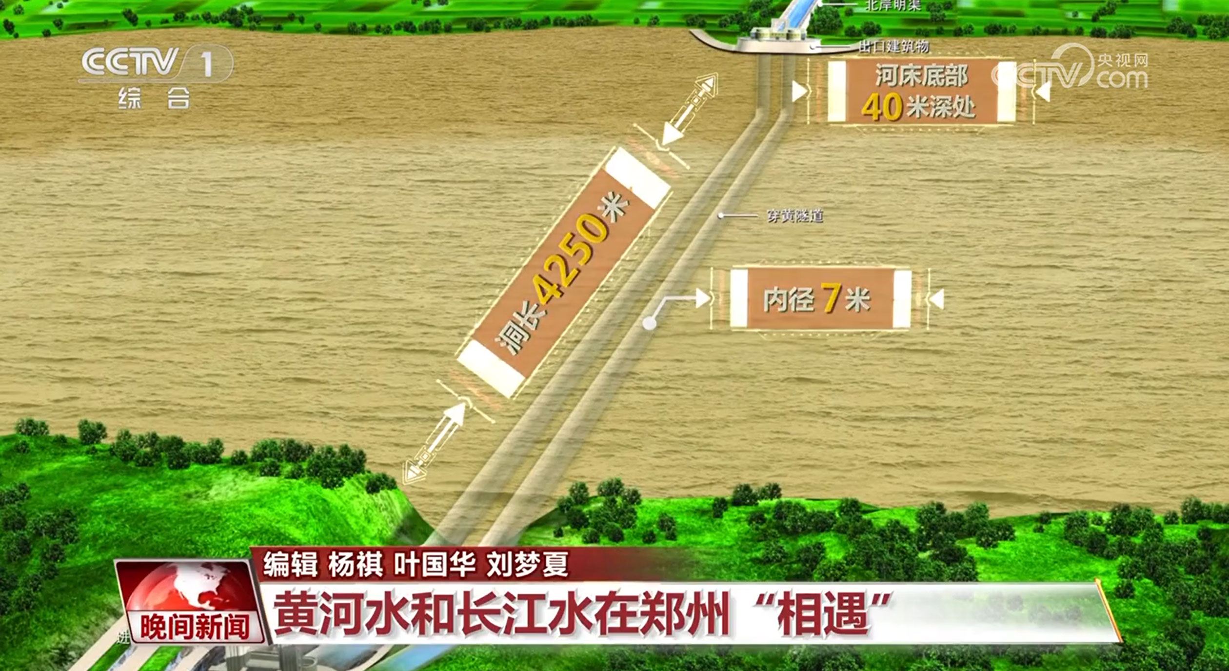 來自丹江口水庫的長江水自渠首出,一路自流向北,黃河成為阻礙南水北去的天然屏障。為了解決這個問題,“穿黃工程”由此誕生?!按S”顧名思義就是“穿越黃河”,黃河河床下復(fù)雜的地質(zhì)條件,注定了穿黃隧道不同于一般的交通隧道,也造就了隧道非同尋常的構(gòu)造。南水北調(diào)工程建設(shè)者在鄭州花園口西黃河河床底部40米深處開鑿兩條隧道,穿黃隧道為雙線有壓輸水隧道,單個洞長4250米,內(nèi)徑7米,這樣的內(nèi)徑可以滿足洞內(nèi)跑汽車。有了“穿黃工程”,北上的長江水通過兩條穿黃隧道與黃河立體交叉相遇,平時,黃河水在上面流,南水北調(diào)的長江水在河底隧道中流過,兩者上下而過,猶如一條巨龍在黃河之下隱去了身影。
