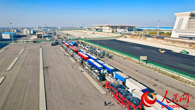 霍爾果斯公路口岸,等待通關的汽車。人民網(wǎng) 李欣洋攝