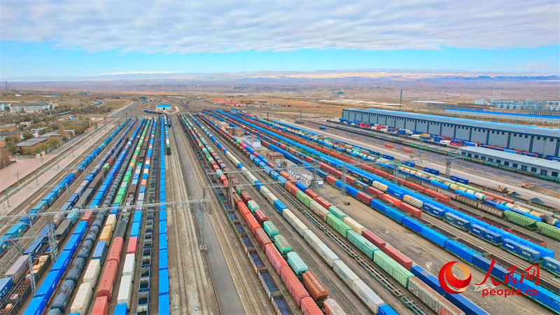 阿拉山口站編組場內??恐l(fā)的中歐班列及其他出入境貨物列車。人民網(wǎng) 李欣洋攝