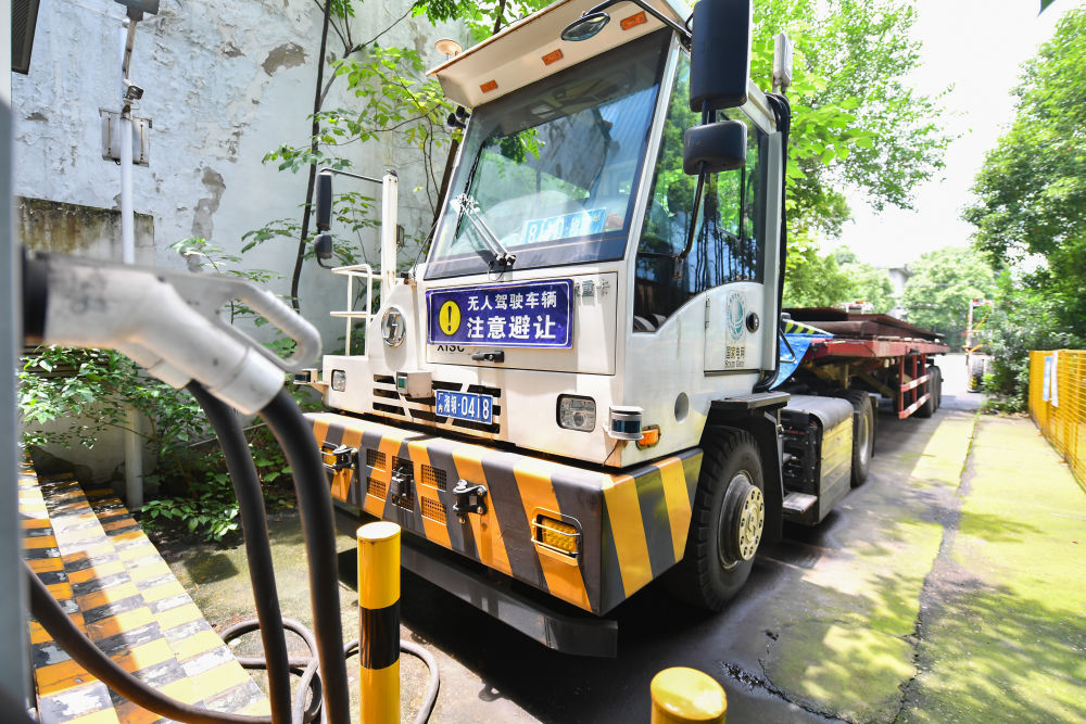 2024年6月13日,在湖南省湘潭市,一臺碼頭無人牽引車??吭谙嫣朵撹F集團(tuán)有限公司的充電站。碼頭無人牽引車?yán)?G通信和北斗定位技術(shù),結(jié)合激光雷達(dá)和相機(jī)等傳感器對周圍的環(huán)境進(jìn)行動態(tài)的高精度建模,實(shí)時(shí)獲取牽引車與掛車的相對位置信息和環(huán)境信息。 新華社記者 陳澤國 攝