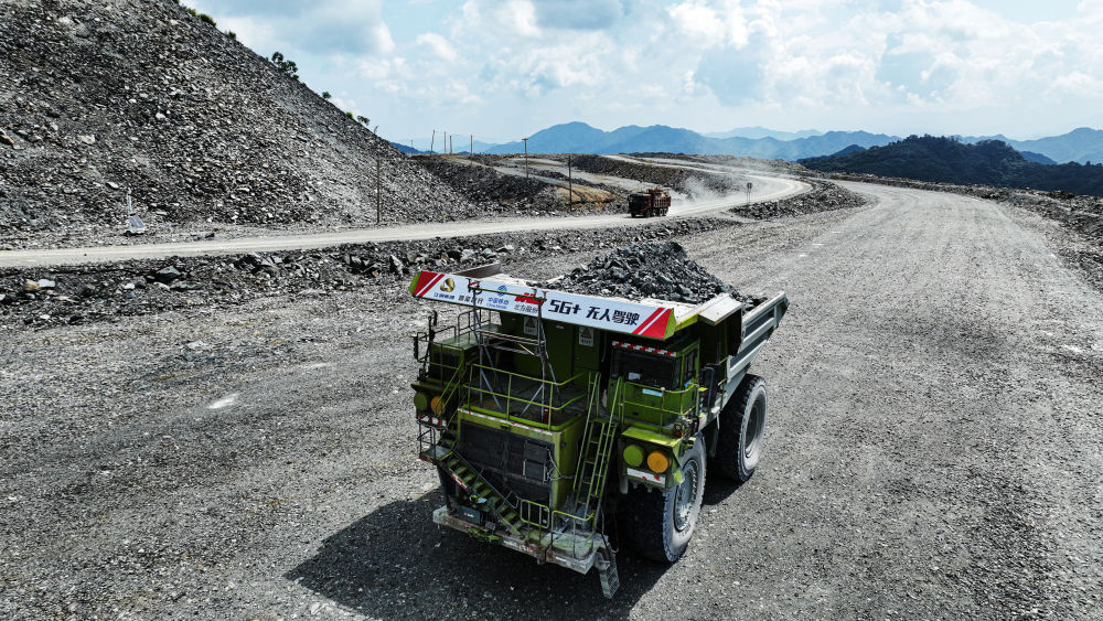 這是江銅集團(tuán)德興銅礦5G智能采礦運(yùn)輸作業(yè)場景(2023年8月24日攝)。電動輪汽車使用“5G+無人駕駛”技術(shù)實(shí)現(xiàn)礦山運(yùn)輸生產(chǎn)裝、運(yùn)、卸全流程作業(yè)過程無人自主運(yùn)行。 新華社發(fā) (張偉峰 攝)