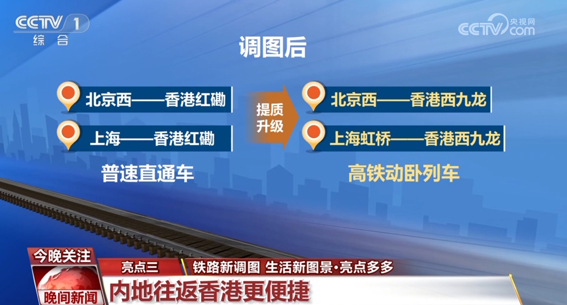 調圖后,北京西、上海與香港紅磡站間開行的普速直通車,提質升級為北京西、上海虹橋與香港西九龍站間的高鐵動臥列車。北京至香港的全程旅行時間由原來的24小時31分壓縮至12小時34分,上海到香港從19小時34分壓縮至11小時14分。京港、滬港間實現(xiàn)夕發(fā)朝至,動臥的出行方式更可省去一晚酒店費用。