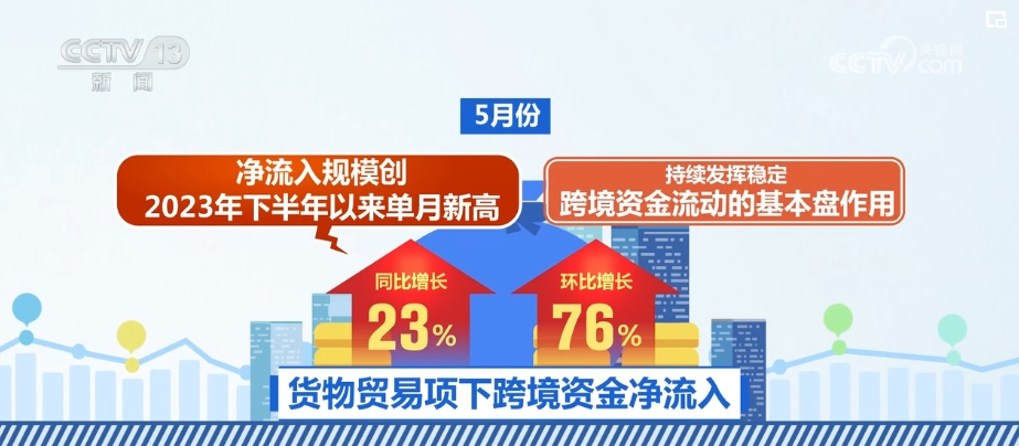 5月份,貨物貿(mào)易項下跨境資金凈流入同比和環(huán)比分別增長23%和76%,凈流入規(guī)模創(chuàng)2023年下半年以來單月新高,持續(xù)發(fā)揮穩(wěn)定跨境資金流動的基本盤作用。同時,外資配置人民幣資產(chǎn)意愿較強(qiáng),5月份,凈買入境內(nèi)債券320億美元,環(huán)比增長86%,處于歷史較高水平。此外,境內(nèi)主體對外各類投資更加平穩(wěn)有序。