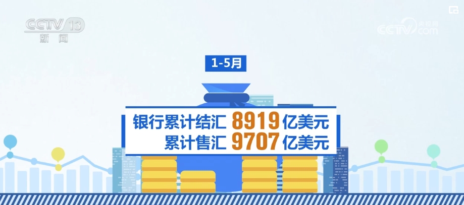 國家外匯管理局最新數(shù)據(jù)顯示,5月,銀行結(jié)匯1760億美元、售匯1919億美元;1—5月,銀行累計結(jié)匯8919億美元、累計售匯9707億美元。