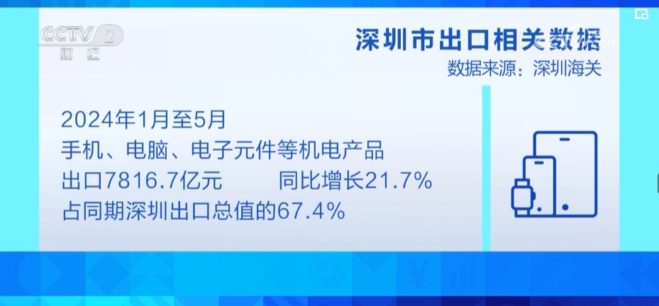 2024年前5個月,深圳市出口總額達(dá)1.16萬億元,同比增長37.2%。其中,手機(jī)、電腦、電子元件等機(jī)電產(chǎn)品出口7816.7億元,同比增長21.7%,占同期深圳出口總值的67.4%。