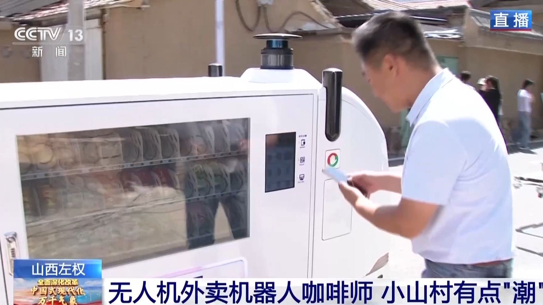這個(gè)小山村里的科技范不止于此,大家通過(guò)鏡頭可以看到,在我身旁往來(lái)不少車輛,它們好像有一些不同,你看這個(gè)在街上到處行進(jìn)的無(wú)人售貨車,我們走到它旁邊就會(huì)停止,然后手機(jī)掃描二維碼可以購(gòu)買到飲料、零食等商品了。