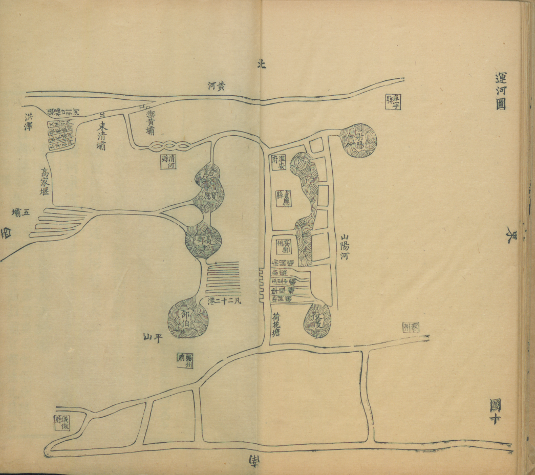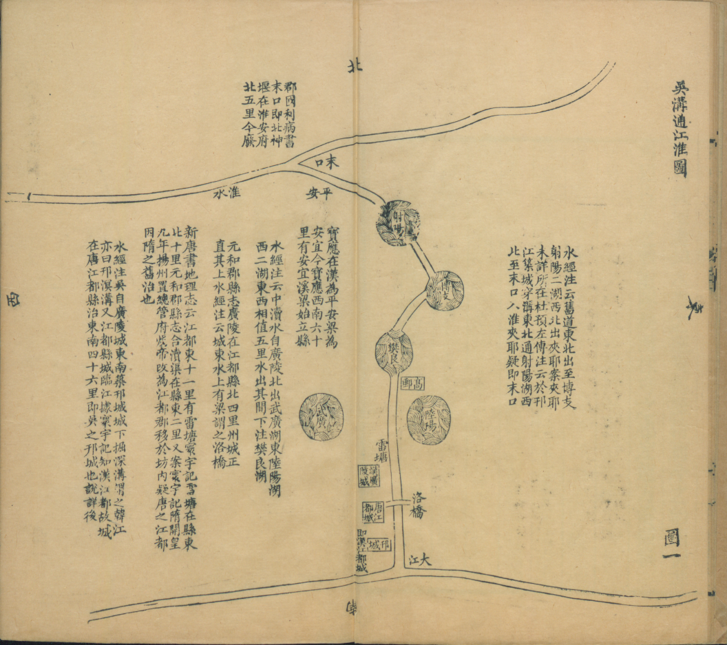 《邗溝故道歷代變遷圖說》(清)徐庭曾撰清光緒三十年(1904)刻本一書,曾以地圖的形式展示了邗溝故道以及歷史上的七次變遷。八幅運河圖,圖版詳實,文字簡明,還標注出了水道的變化。