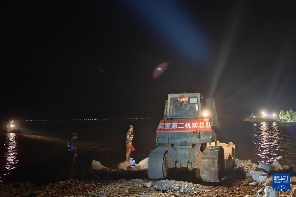 7月7日凌晨,在湖南省岳陽市華容縣團洲垸洞庭湖一線堤防決口處,武警部隊官兵連夜組織施工作業(yè)。新華社記者 黎云 攝