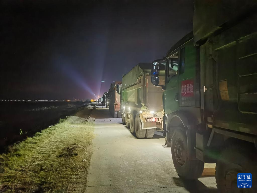 時間指向凌晨4點,通向決口的公路上,滿載石料的卡車、工程車輛仍然排著“長龍”,蜿蜒3公里長,機械的轟鳴聲響徹大堤。
