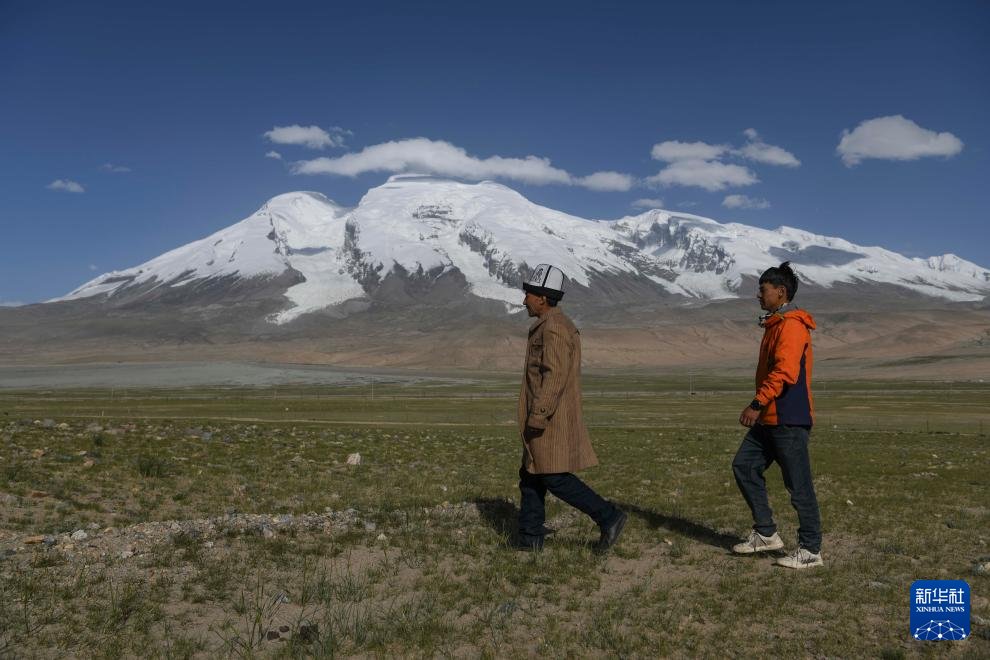 7月6日,塔西巴伊(右)和父親加尼拜克路過(guò)慕士塔格峰腳下的牧場(chǎng)。新華社記者 胡虎虎 攝