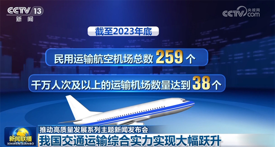 五年來,客貨運(yùn)輸不斷發(fā)展,群眾出行更加舒適便捷,貨物運(yùn)輸更加順暢高效。截至2023年底,我國(guó)鐵路營(yíng)業(yè)里程15.9萬(wàn)公里,其中高鐵營(yíng)業(yè)里程4.5萬(wàn)公里;全國(guó)公路里程543.68萬(wàn)公里,其中高速公路里程18.36萬(wàn)公里;民用運(yùn)輸航空機(jī)場(chǎng)總數(shù)259個(gè),千萬(wàn)人次及以上的運(yùn)輸機(jī)場(chǎng)數(shù)量達(dá)到38個(gè)。