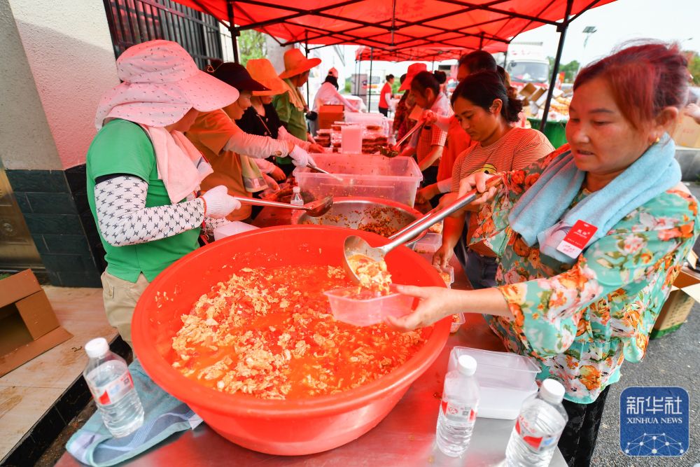 7月10日,在岳陽市良心堡鎮(zhèn)望君洲村,志愿者倒出炒好的菜肴準備打包。新華社記者 陳振海 攝
