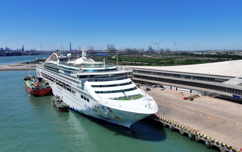 5月15日,“夢(mèng)想”號(hào)郵輪??吭谔旖驀?guó)際郵輪母港(無(wú)人機(jī)照片)。新華社記者 趙子碩 攝